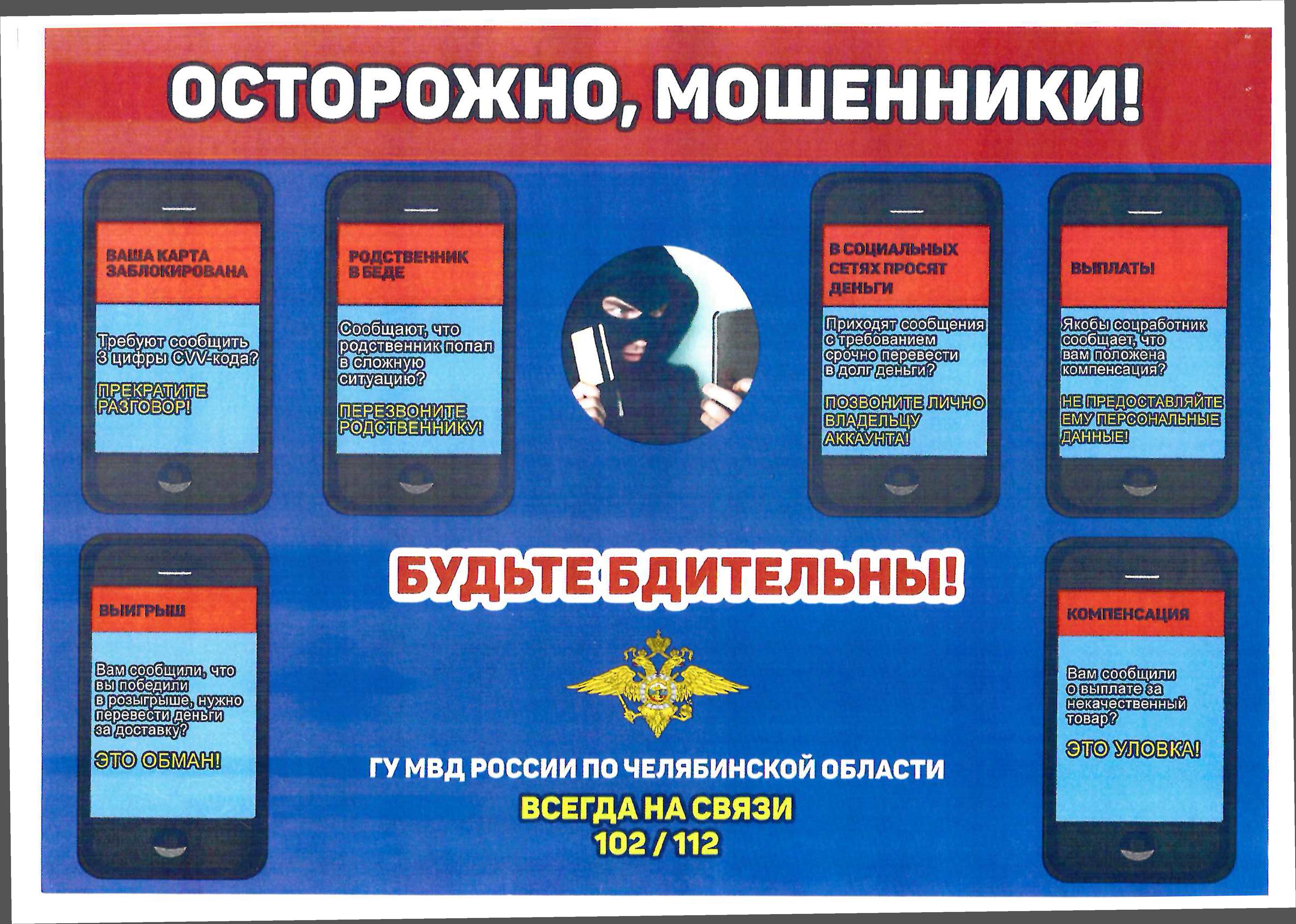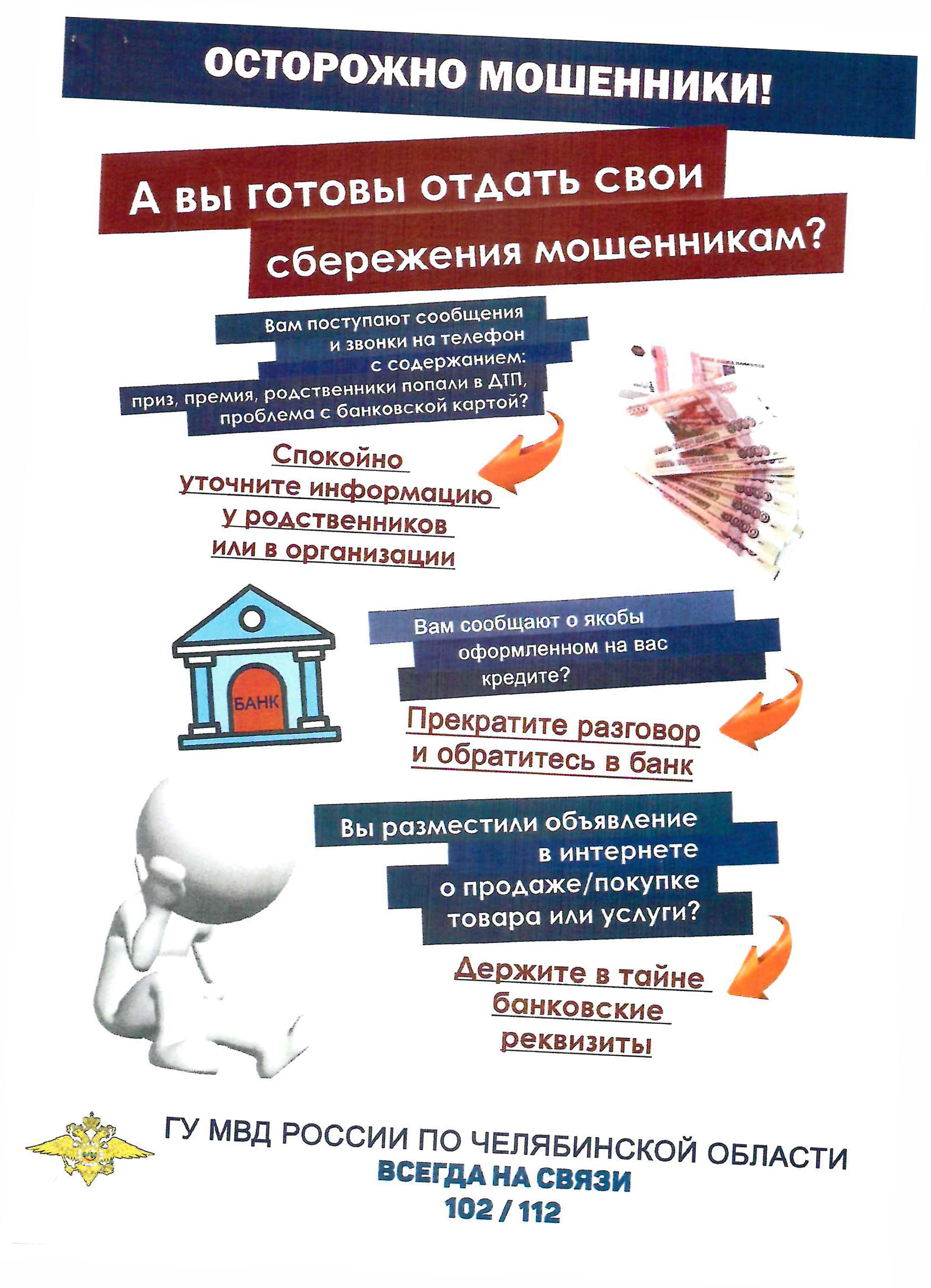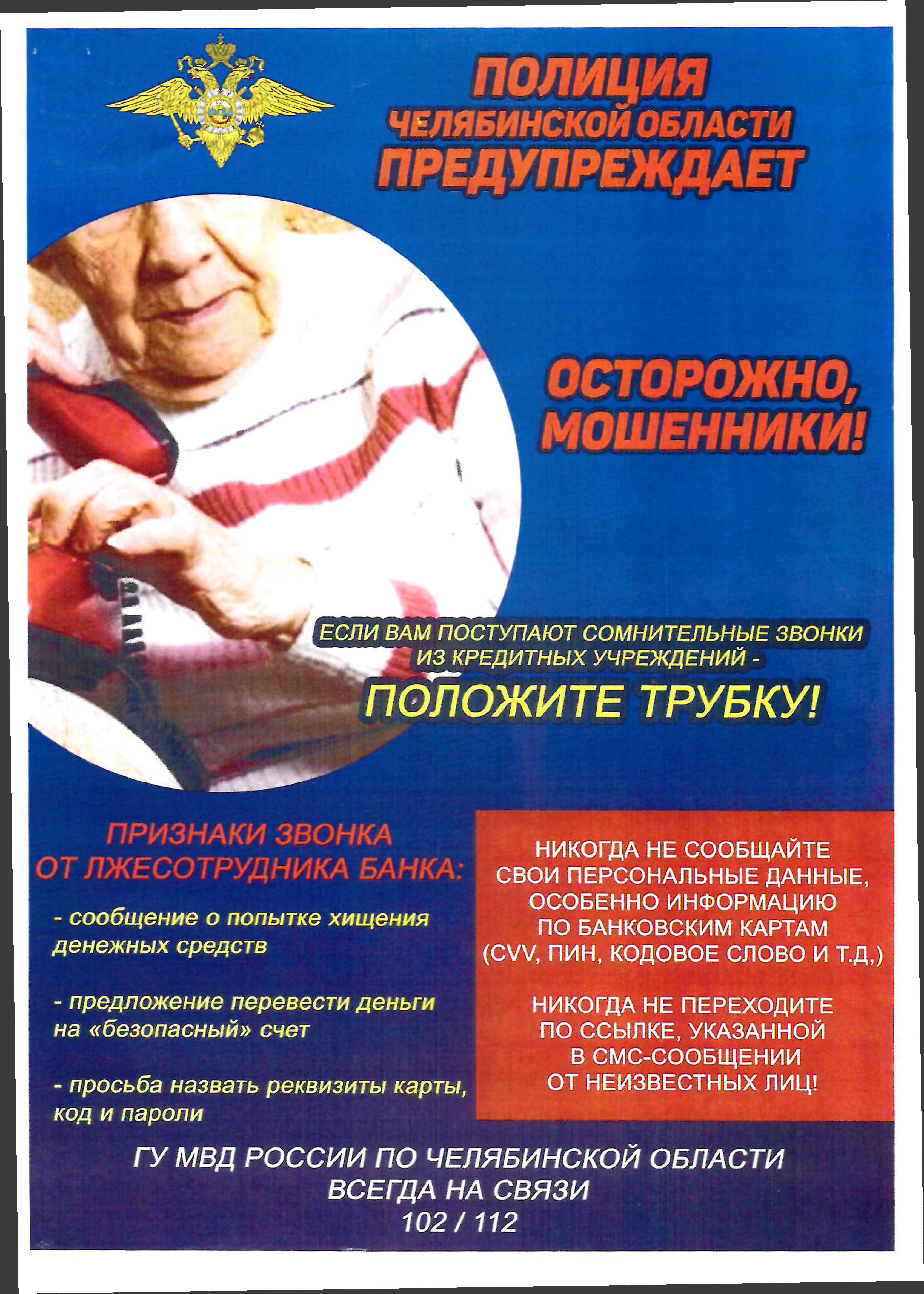ГУ МВД России по Челябинской области предупреждает, чтобы не стать жертвой мошенников необходимо выполнять несложные рекомендации: (откройте сообщение и просмотрите)