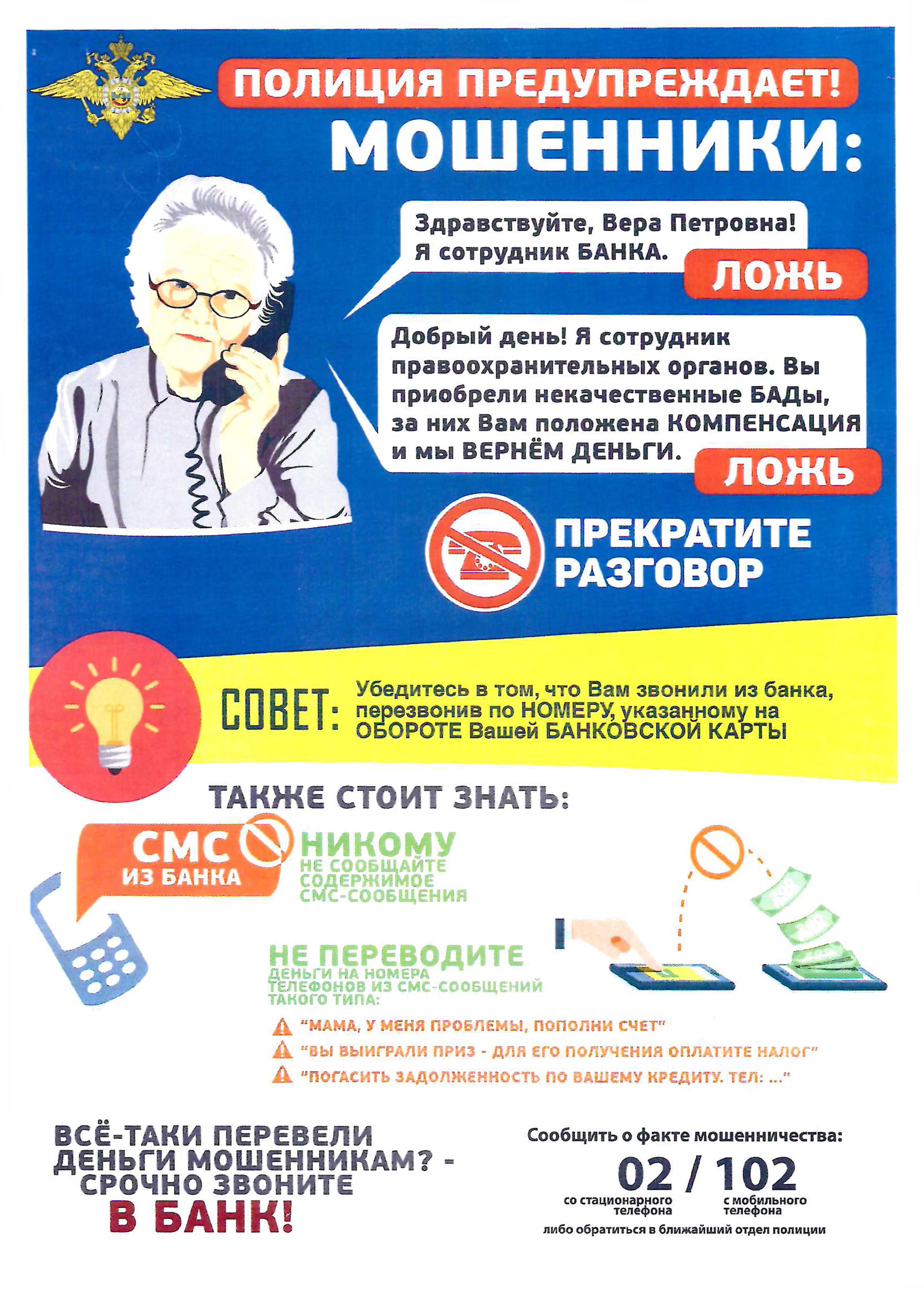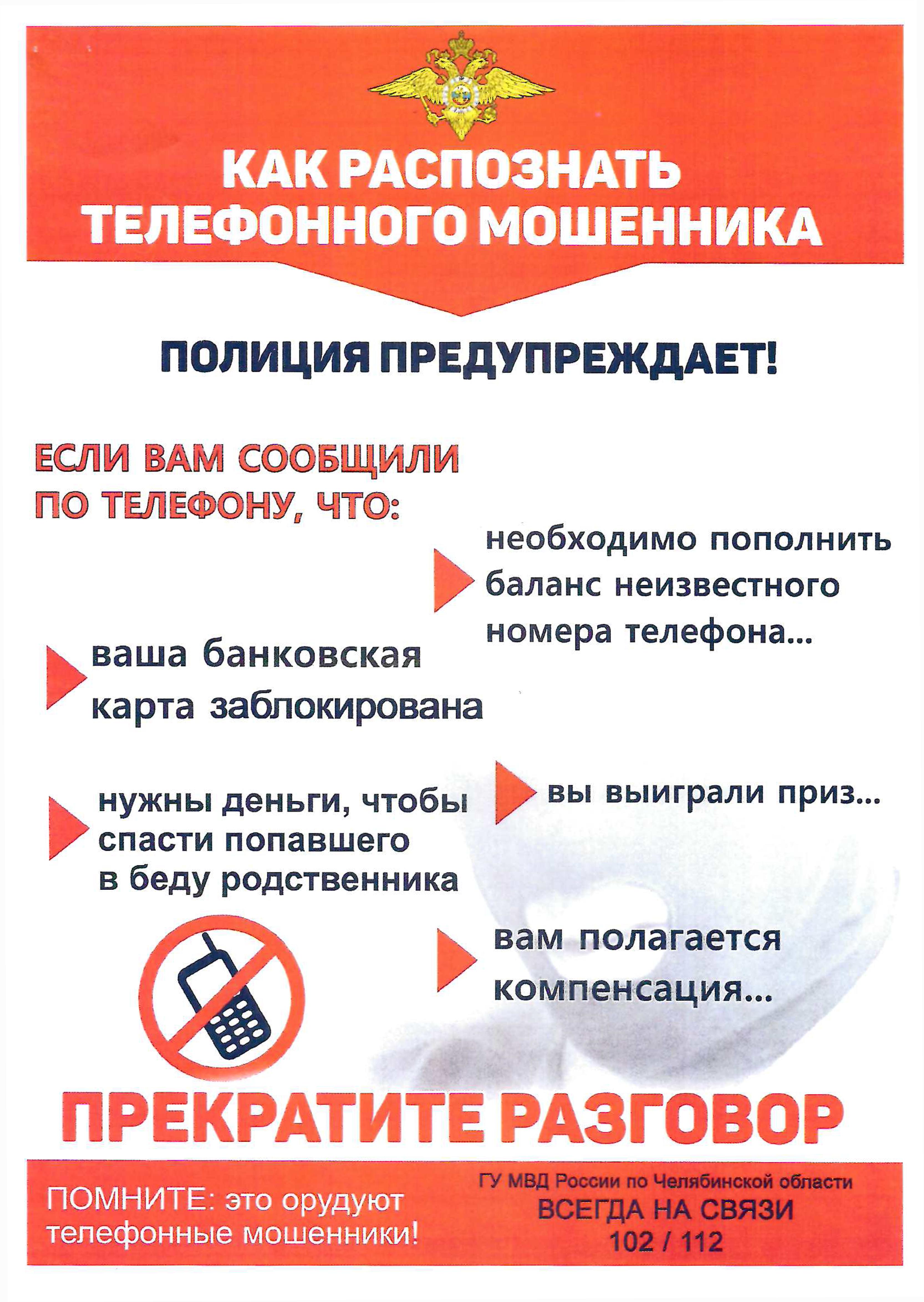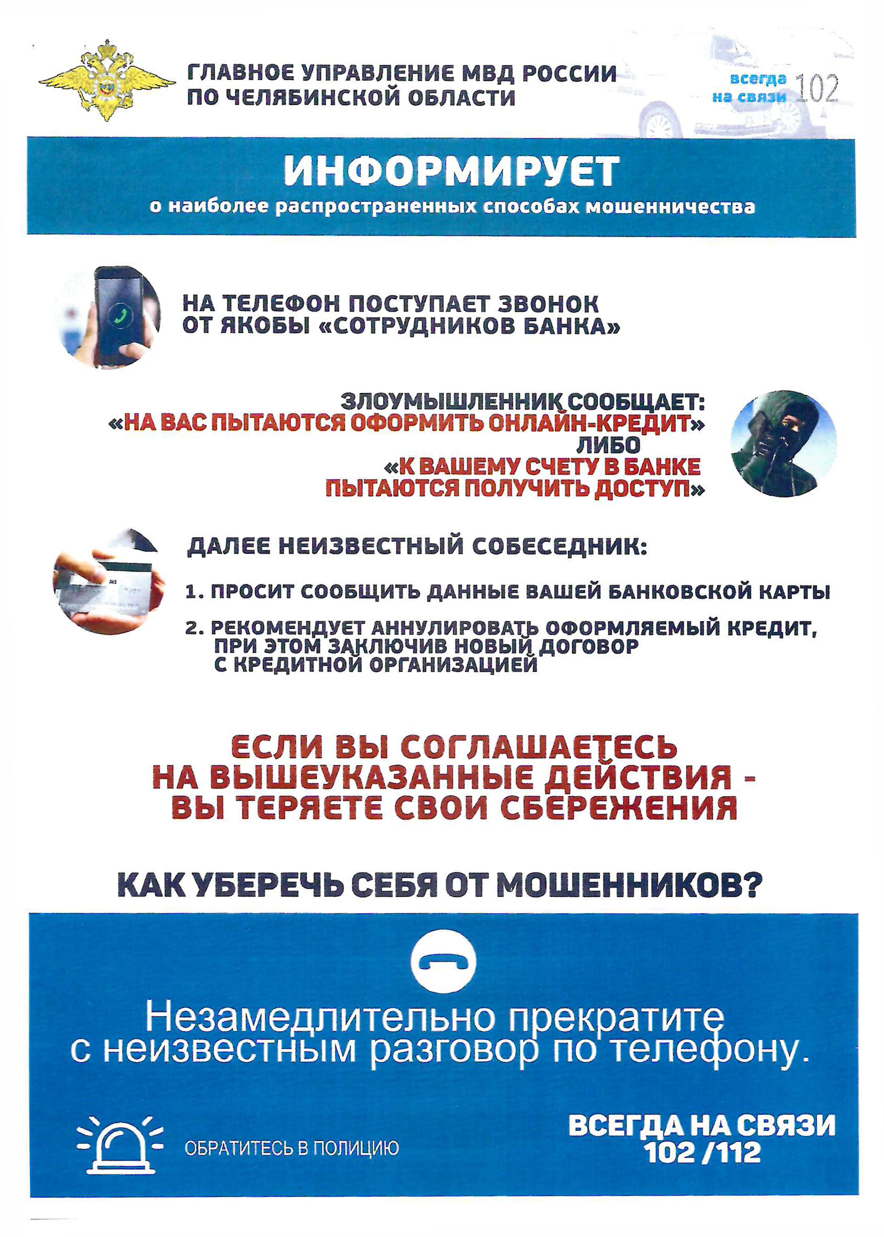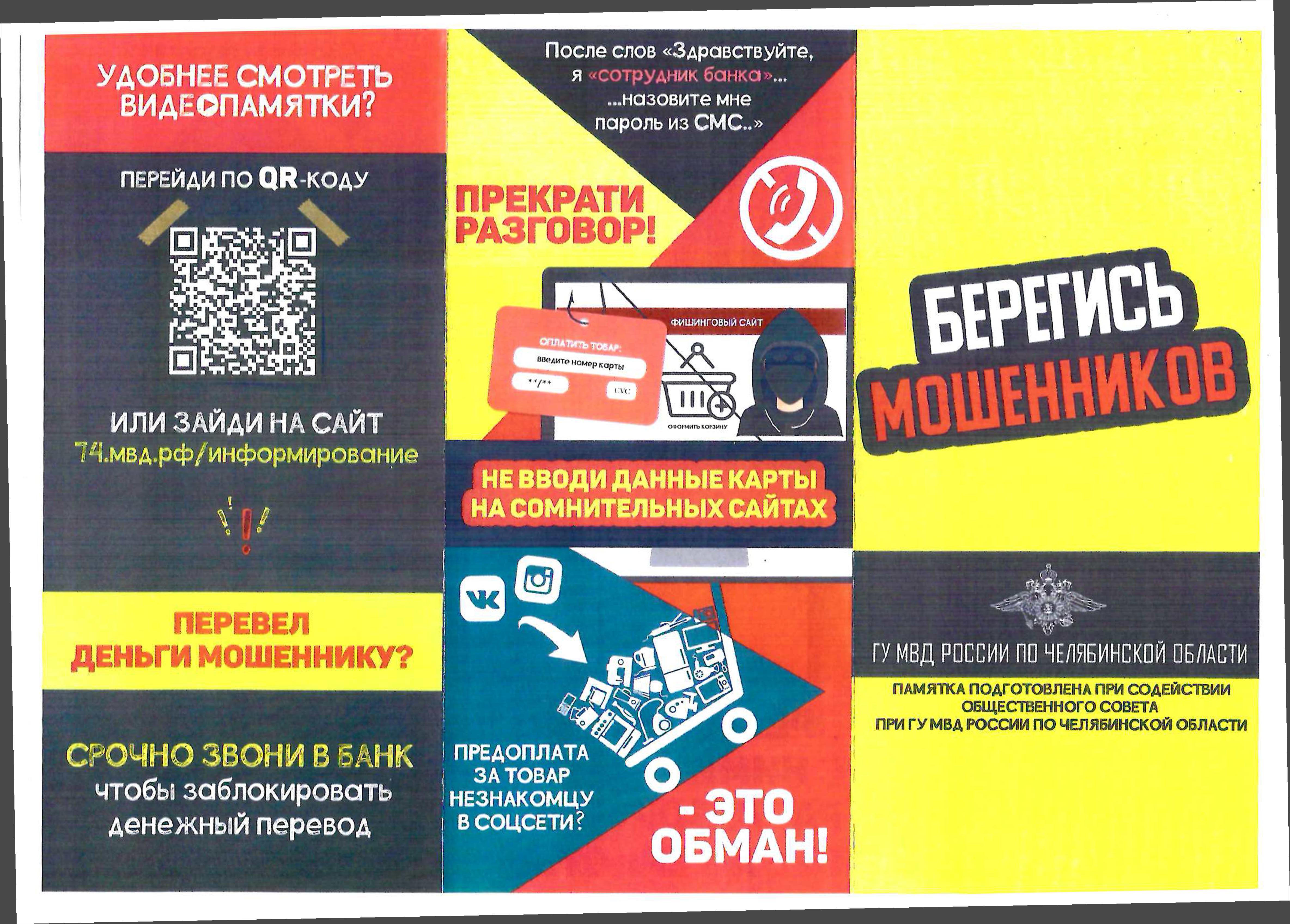 ГУ МВД России по Челябинской области предупреждает, чтобы не стать жертвой мошенников необходимо выполнять несложные рекомендации: (откройте сообщение и просмотрите)